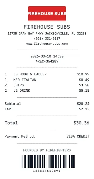 Submit per diem or actual expense claims for dining at Firehouse Subs during business trips. Our receipts include all the details your finance team needs: date, time, location, and itemized charges.