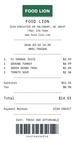 Generate a realistic Food Lion grocery receipt with our free tool. Our grocery receipt format includes department codes, item SKUs, weight-based pricing for produce and deli, coupon discounts, loyalty card savings, and the classic "YOU SAVED $X.XX" summary line that real grocery receipts feature.