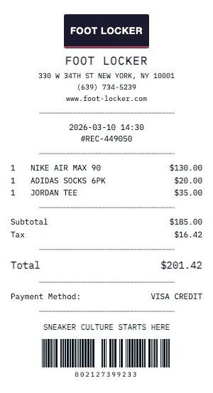 Whether you need a Foot Locker receipt for a warranty claim, return authorization, price adjustment, or expense documentation, our generator creates receipts that look exactly like the real thing. Customize store number, register number, transaction ID, and barcode.