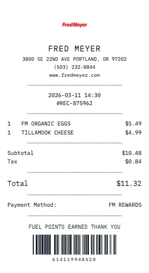 Building a price comparison database? Generate standardized Fred Meyer receipts to track and compare product prices across stores, dates, and promotions.