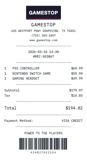 Whether you need a GameStop receipt for a warranty claim, return authorization, price adjustment, or expense documentation, our generator creates receipts that look exactly like the real thing. Customize store number, register number, transaction ID, and barcode.