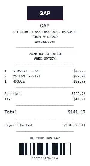 Whether you need a Gap receipt for a warranty claim, return authorization, price adjustment, or expense documentation, our generator creates receipts that look exactly like the real thing. Customize store number, register number, transaction ID, and barcode.