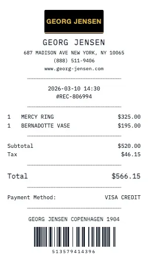 Whether you need a Georg Jensen receipt for insurance appraisal, resale authentication, gift documentation, or personal collection records, our generator produces receipts with the attention to detail that luxury brands are known for. Add care instructions, warranty terms, and boutique contact information.