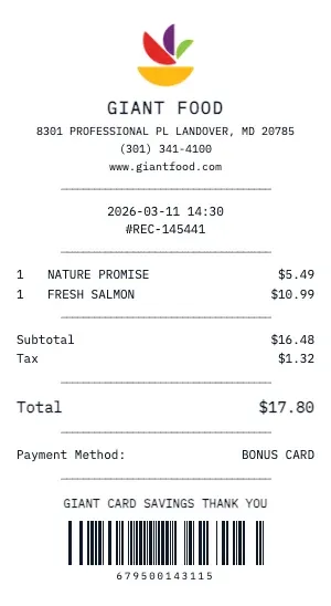 Building a price comparison database? Generate standardized Giant Food receipts to track and compare product prices across stores, dates, and promotions.
