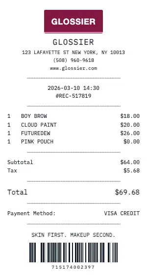 Generate a professional Glossier beauty receipt with product categories, shade/color names, loyalty rewards, and sample tracking. Our beauty receipt format matches retail cosmetics counters and beauty store POS systems.