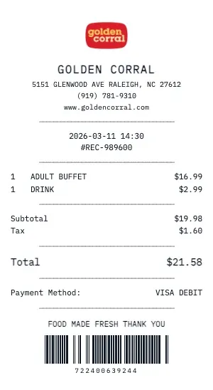 Submit per diem or actual expense claims for dining at Golden Corral during business trips. Our receipts include all the details your finance team needs: date, time, location, and itemized charges.