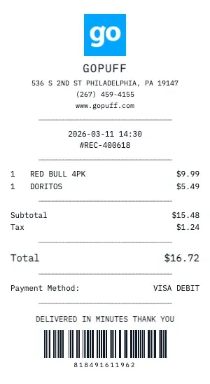 Building a price comparison database? Generate standardized Gopuff receipts to track and compare product prices across stores, dates, and promotions.