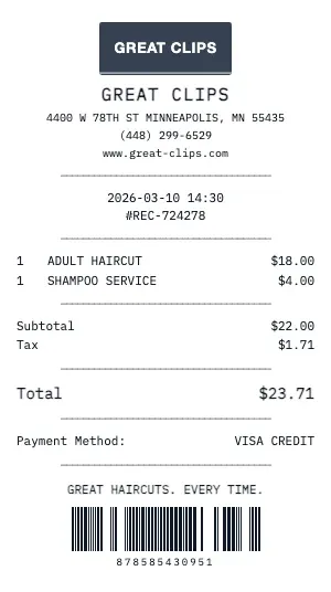 Whether you need a Great Clips receipt for a warranty claim, return authorization, price adjustment, or expense documentation, our generator creates receipts that look exactly like the real thing. Customize store number, register number, transaction ID, and barcode.