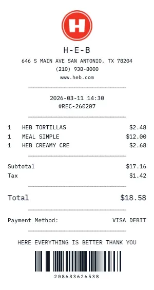 Generate a realistic H-E-B grocery receipt with our free tool. Our grocery receipt format includes department codes, item SKUs, weight-based pricing for produce and deli, coupon discounts, loyalty card savings, and the classic "YOU SAVED $X.XX" summary line that real grocery receipts feature.