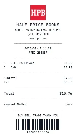 Whether you need a Half Price Books receipt for a warranty claim, return authorization, price adjustment, or expense documentation, our generator creates receipts that look exactly like the real thing. Customize store number, register number, transaction ID, and barcode.