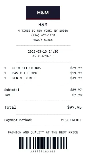 Whether you need a H&M receipt for a warranty claim, return authorization, price adjustment, or expense documentation, our generator creates receipts that look exactly like the real thing. Customize store number, register number, transaction ID, and barcode.