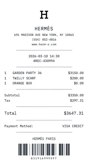 Whether you need a Hermès receipt for insurance appraisal, resale authentication, gift documentation, or personal collection records, our generator produces receipts with the attention to detail that luxury brands are known for. Add care instructions, warranty terms, and boutique contact information.