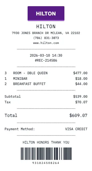 Every detail matters. Here\u2019s what a genuine Hilton receipt includes \u2014 and how our generator replicates each element.