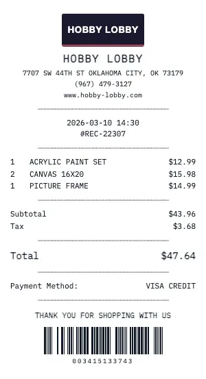 Whether you need a Hobby Lobby receipt for a warranty claim, return authorization, price adjustment, or expense documentation, our generator creates receipts that look exactly like the real thing. Customize store number, register number, transaction ID, and barcode.