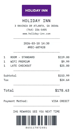 Every detail matters. Here\u2019s what a genuine Holiday Inn receipt includes \u2014 and how our generator replicates each element.