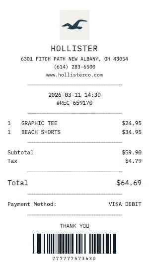 Whether you need a Hollister receipt for a warranty claim, return authorization, price adjustment, or expense documentation, our generator creates receipts that look exactly like the real thing. Customize store number, register number, transaction ID, and barcode.