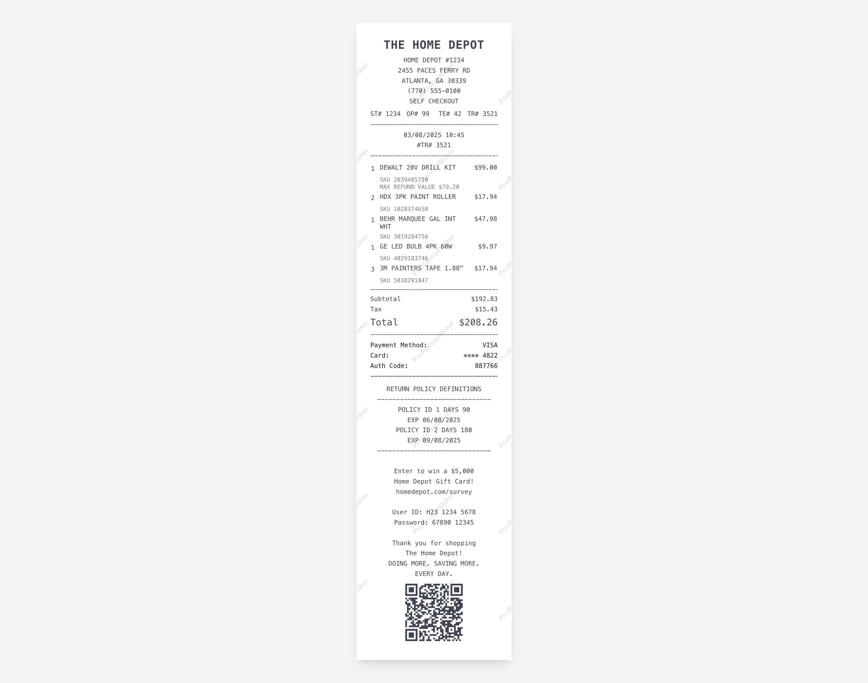 Generate a realistic Home Depot receipt with our professional receipt maker. The Home Depot is the largest home improvement retailer in the world, with over 2,300 stores across the United States and annual revenue exceeding $150 billion. Home Depot receipts are essential documents for contractors, DIY homeowners, and property managers — and their format reflects this with detailed SKU numbers, return policy definitions, and the unique survey invitation section. Our template replicates the complete Home Depot receipt format, from 'THE HOME DEPOT' header to the 'DOING MORE. SAVING MORE. EVERY DAY.' tagline.