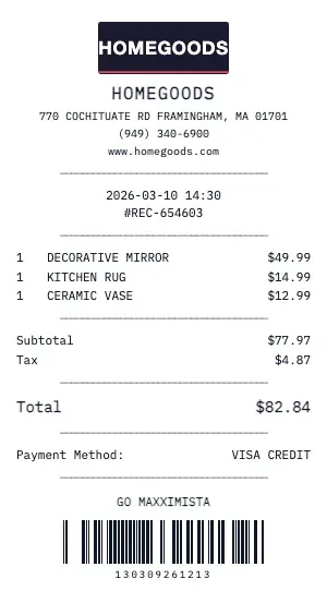 Need documentation for a HomeGoods return? Generate a receipt with the correct return policy dates, original payment method, and item condition notes.