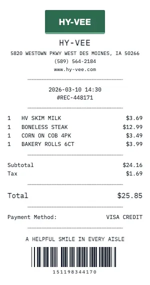 Generate a realistic Hy-Vee grocery receipt with our free tool. Our grocery receipt format includes department codes, item SKUs, weight-based pricing for produce and deli, coupon discounts, loyalty card savings, and the classic "YOU SAVED $X.XX" summary line that real grocery receipts feature.