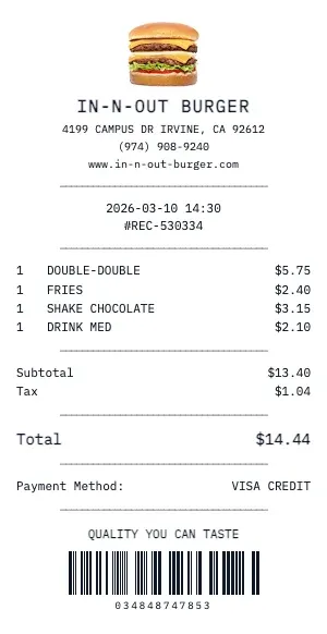Every In-N-Out Burger receipt from our tool includes the details diners expect — appetizers, entrées, drinks, desserts, subtotal, tax, tip amount, and total. You can customize the server name, table number, and even add a "Thank You" footer message. Our restaurant receipt format matches what real POS systems like Toast, Square, and Clover produce.