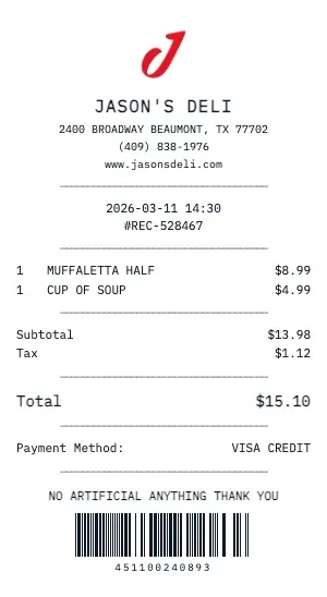 Need a Jason's Deli restaurant receipt? Our generator creates authentic dining receipts complete with itemized food and beverage orders, server name, table number, tip line, and gratuity calculations. Whether you're documenting a business dinner or replacing a faded receipt, ProReceiptMaker delivers the most realistic Jason's Deli receipt available online.