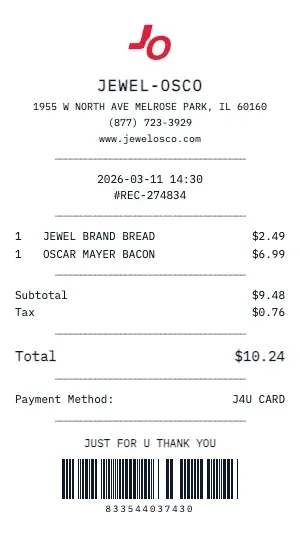 Building a price comparison database? Generate standardized Jewel-Osco receipts to track and compare product prices across stores, dates, and promotions.