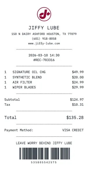 Whether you need a Jiffy Lube receipt for a warranty claim, return authorization, price adjustment, or expense documentation, our generator creates receipts that look exactly like the real thing. Customize store number, register number, transaction ID, and barcode.