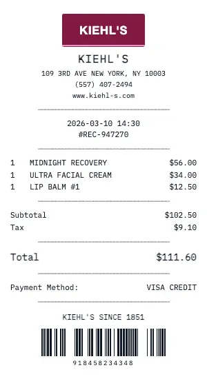 Perfect for beauty enthusiasts tracking their skincare routines, makeup artists documenting kit purchases, or anyone needing a Kiehl's receipt for returns and exchanges. Our generator includes fields for tester/sample requests and consultation notes.