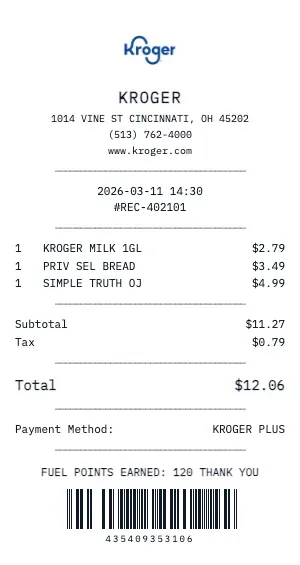 Building a price comparison database? Generate standardized Kroger receipts to track and compare product prices across stores, dates, and promotions.