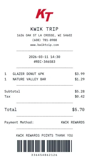 Whether you need a Kwik Trip receipt for a warranty claim, return authorization, price adjustment, or expense documentation, our generator creates receipts that look exactly like the real thing. Customize store number, register number, transaction ID, and barcode.