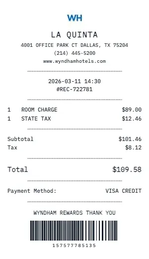 Whether you need a La Quinta receipt for a warranty claim, return authorization, price adjustment, or expense documentation, our generator creates receipts that look exactly like the real thing. Customize store number, register number, transaction ID, and barcode.