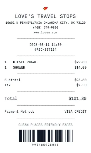 Whether you need a Love's Travel Stops receipt for a warranty claim, return authorization, price adjustment, or expense documentation, our generator creates receipts that look exactly like the real thing. Customize store number, register number, transaction ID, and barcode.