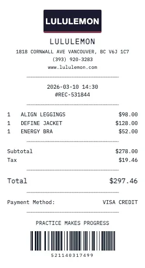 Whether you need a Lululemon receipt for a warranty claim, return authorization, price adjustment, or expense documentation, our generator creates receipts that look exactly like the real thing. Customize store number, register number, transaction ID, and barcode.