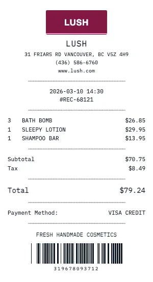 Our Lush template supports beauty-specific details: shade matching notes, skin type recommendations, ingredient allergy flags, subscription box credits, and employee discount indicators. Create receipts that look exactly like the real in-store printouts.