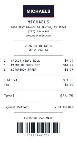 Whether you need a Michaels receipt for a warranty claim, return authorization, price adjustment, or expense documentation, our generator creates receipts that look exactly like the real thing. Customize store number, register number, transaction ID, and barcode.