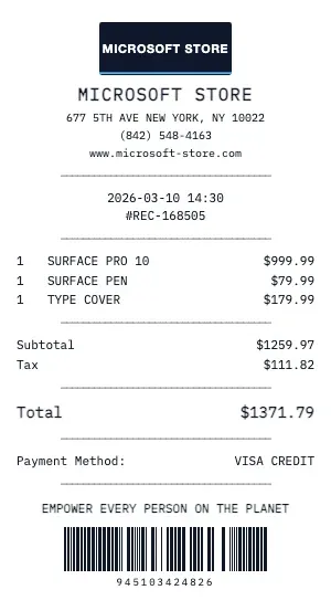 Our Microsoft Store template handles electronics-specific transactions: trade-in credit applied, carrier activation fees, monthly installment plan details, screen protector and case add-ons, and recycling fee charges. The perfect tool for documenting tech purchases and protecting your investment.