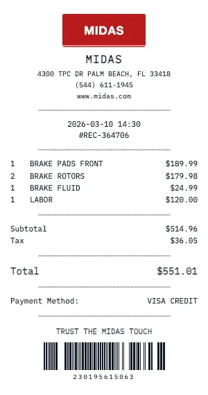 Maintain a complete Midas service record for your vehicle. Our receipt includes VIN, mileage, services performed, and parts used — essential for resale value and warranty compliance.