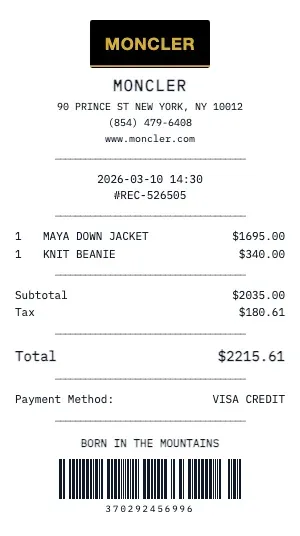 Whether you need a Moncler receipt for insurance appraisal, resale authentication, gift documentation, or personal collection records, our generator produces receipts with the attention to detail that luxury brands are known for. Add care instructions, warranty terms, and boutique contact information.