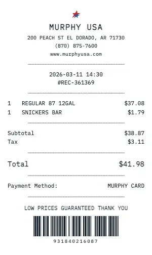 Track fuel costs from Murphy USA for IRS-standard mileage deduction or employer mileage reimbursement programs. Our receipts show gallons, price, and location for audit-ready records.