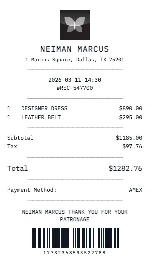 Whether you need a Neiman Marcus receipt for insurance appraisal, resale authentication, gift documentation, or personal collection records, our generator produces receipts with the attention to detail that luxury brands are known for. Add care instructions, warranty terms, and boutique contact information.