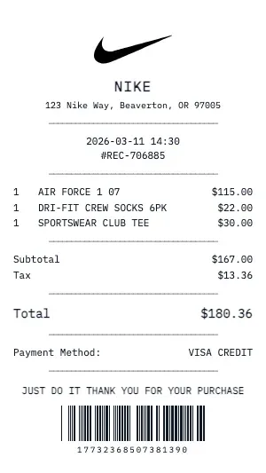 Whether you need a Nike receipt for a warranty claim, return authorization, price adjustment, or expense documentation, our generator creates receipts that look exactly like the real thing. Customize store number, register number, transaction ID, and barcode.