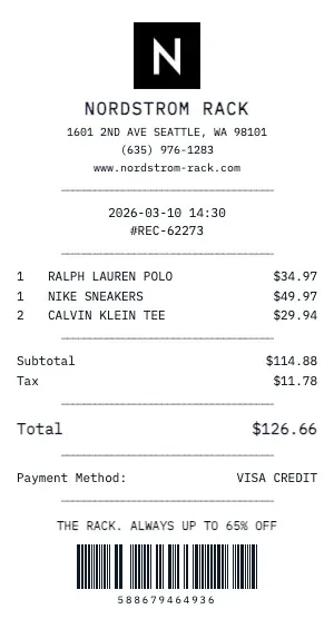 Create a professional Nordstrom Rack retail receipt with our free generator. Our retail receipt format includes item descriptions, SKU/UPC numbers, sizing information, color variants, original vs. sale pricing, and return policy details — matching the format of major retail POS systems.