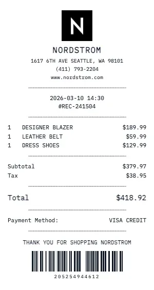 Create a professional Nordstrom retail receipt with our free generator. Our retail receipt format includes item descriptions, SKU/UPC numbers, sizing information, color variants, original vs. sale pricing, and return policy details — matching the format of major retail POS systems.