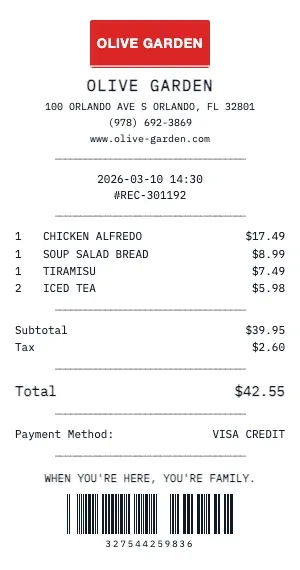 Every detail matters. Here\u2019s what a genuine Olive Garden receipt includes \u2014 and how our generator replicates each element.