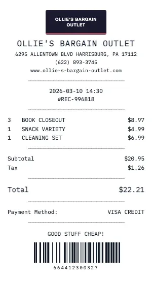 Whether you need a Ollie's Bargain Outlet receipt for a warranty claim, return authorization, price adjustment, or expense documentation, our generator creates receipts that look exactly like the real thing. Customize store number, register number, transaction ID, and barcode.