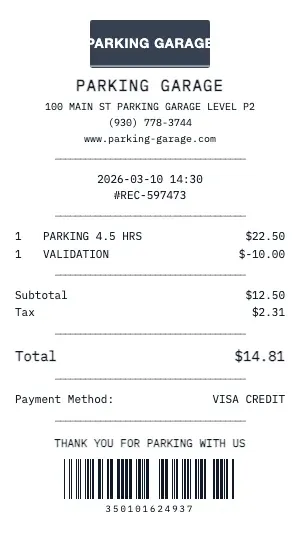 Whether you need a Parking Garage receipt for a warranty claim, return authorization, price adjustment, or expense documentation, our generator creates receipts that look exactly like the real thing. Customize store number, register number, transaction ID, and barcode.