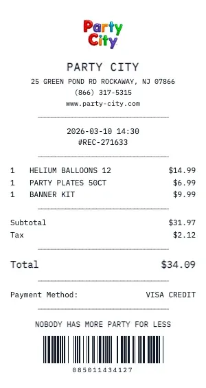 Whether you need a Party City receipt for a warranty claim, return authorization, price adjustment, or expense documentation, our generator creates receipts that look exactly like the real thing. Customize store number, register number, transaction ID, and barcode.
