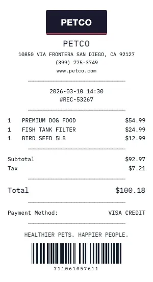 Need documentation for a Petco return? Generate a receipt with the correct return policy dates, original payment method, and item condition notes.