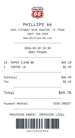 Create a realistic Phillips 66 gas station receipt for fuel purchases, car washes, or convenience store items. Our generator includes pump number, fuel grade (Regular, Plus, Premium, Diesel), gallons dispensed, price per gallon, and total cost — exactly like a real fuel receipt.
