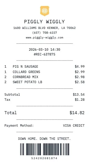 Generate a realistic Piggly Wiggly grocery receipt with our free tool. Our grocery receipt format includes department codes, item SKUs, weight-based pricing for produce and deli, coupon discounts, loyalty card savings, and the classic "YOU SAVED $X.XX" summary line that real grocery receipts feature.